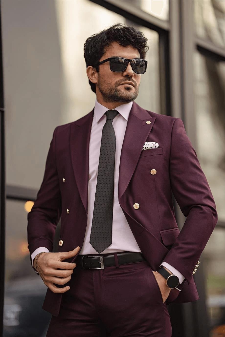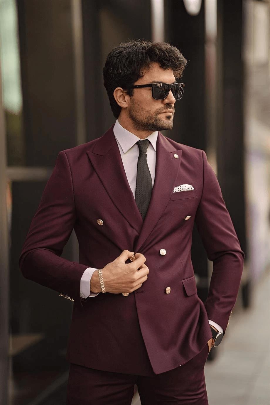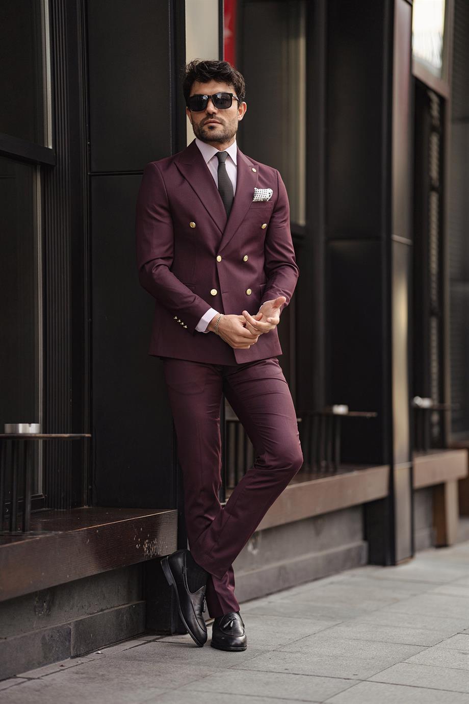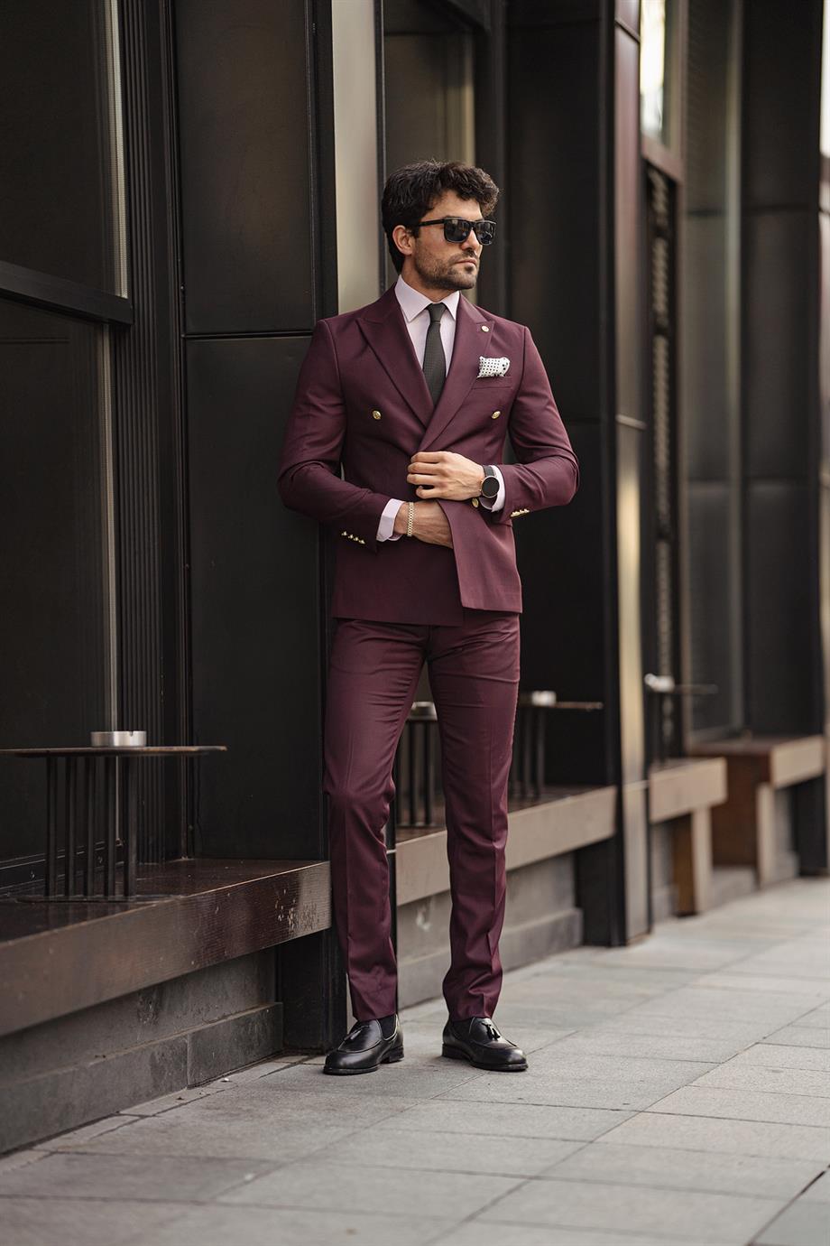 Guild Jesus Slim Fit Zweireihiger Anzug Weinroter