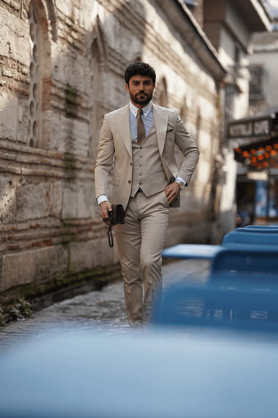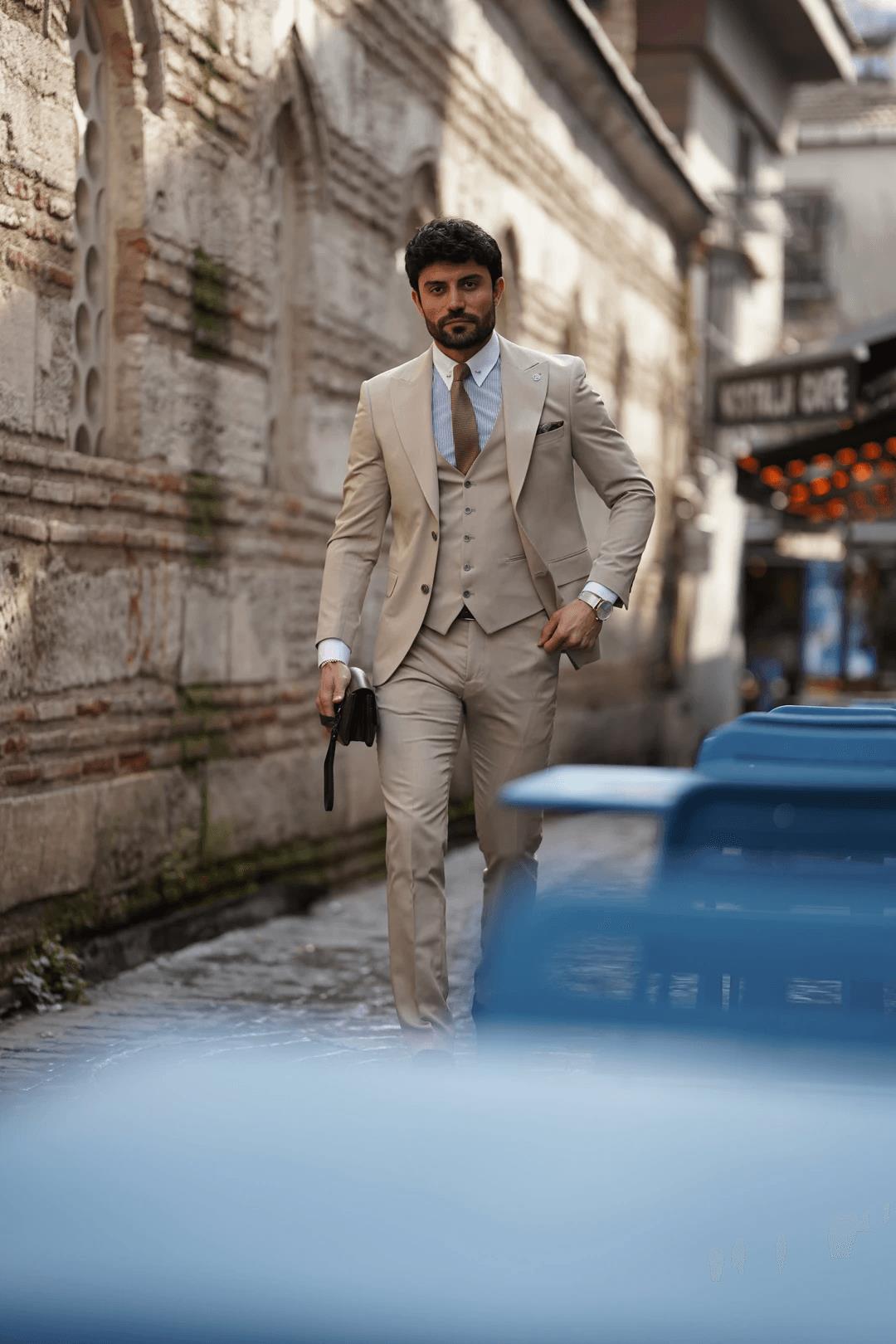 Guild Portici Slim Fit 3-teilig mit Weste Anzug Beige