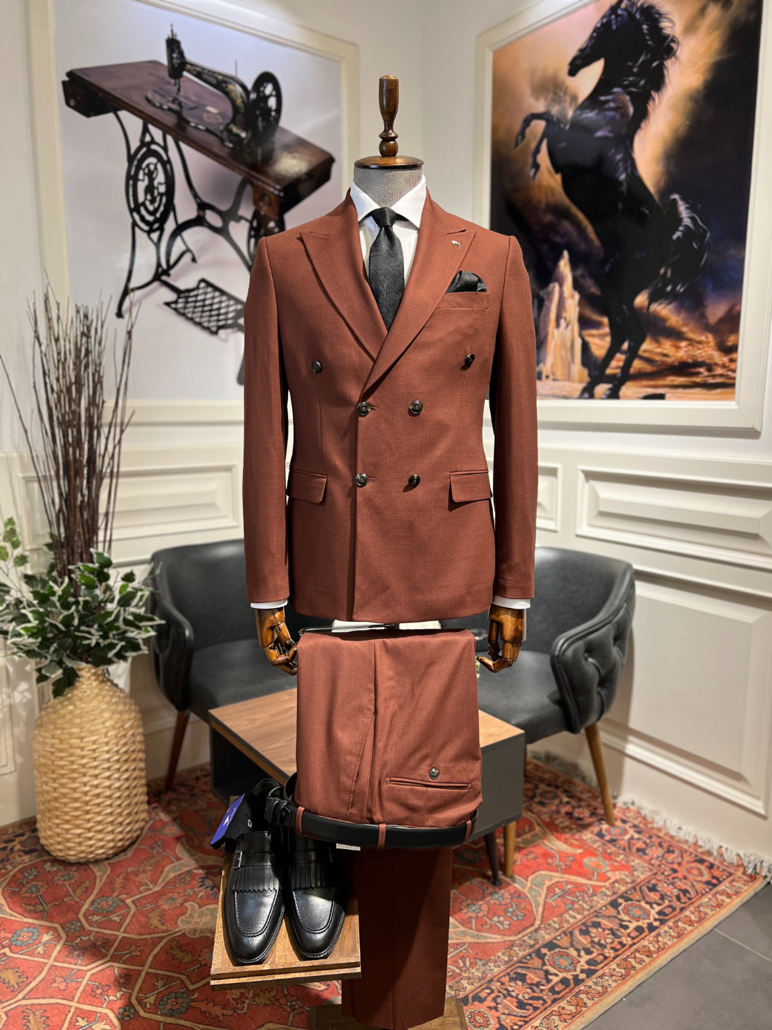 Dieser Herrenanzug, ein Symbol für Eleganz und Kraft, wird Ihnen das Gefühl geben, etwas Besonderes zu sein, wenn jeder Moment wichtig ist. Dieser Anzug, bei dem jedes Detail sorgfältig durchdacht ist, spiegelt Ihren Stil und Ihr Selbstbewusstsein wider und lässt Sie gleichzeitig im Mittelpunkt jedes Looks stehen.